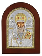 Николай Чудотворец, серебряная икона в деревянном киоте, золочение, цветная эмаль