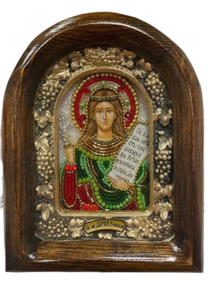 Икона Святая Дария Римская бисером в арочном киоте из массива дерева.
