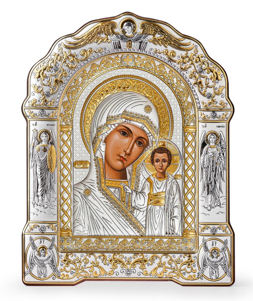Икона “Казанская Божия Матерь” шелкография, серебряный оклад, золочение, белое дерево. От греческого производителя “Silver Canvas”