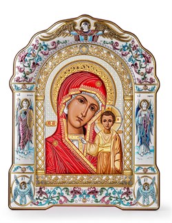 Икона “Казанская Божия Матерь” греческая икона в деревянном киоте (красное дерево), шелкография, цветной оклад. От греческого производителя “Silver Canvas”