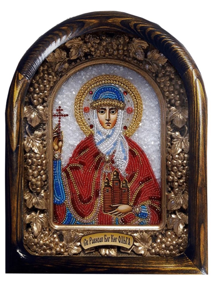 Икона Святая Равноапостольная княгиня Ольга бисером в деревяном киоте.