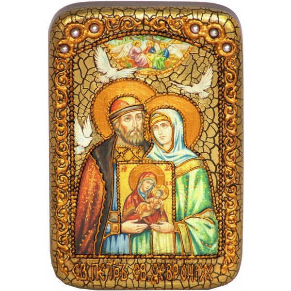 Подарочная икона Святые Петр и Феврония в авторском стиле под старину в деревянной шкатулке