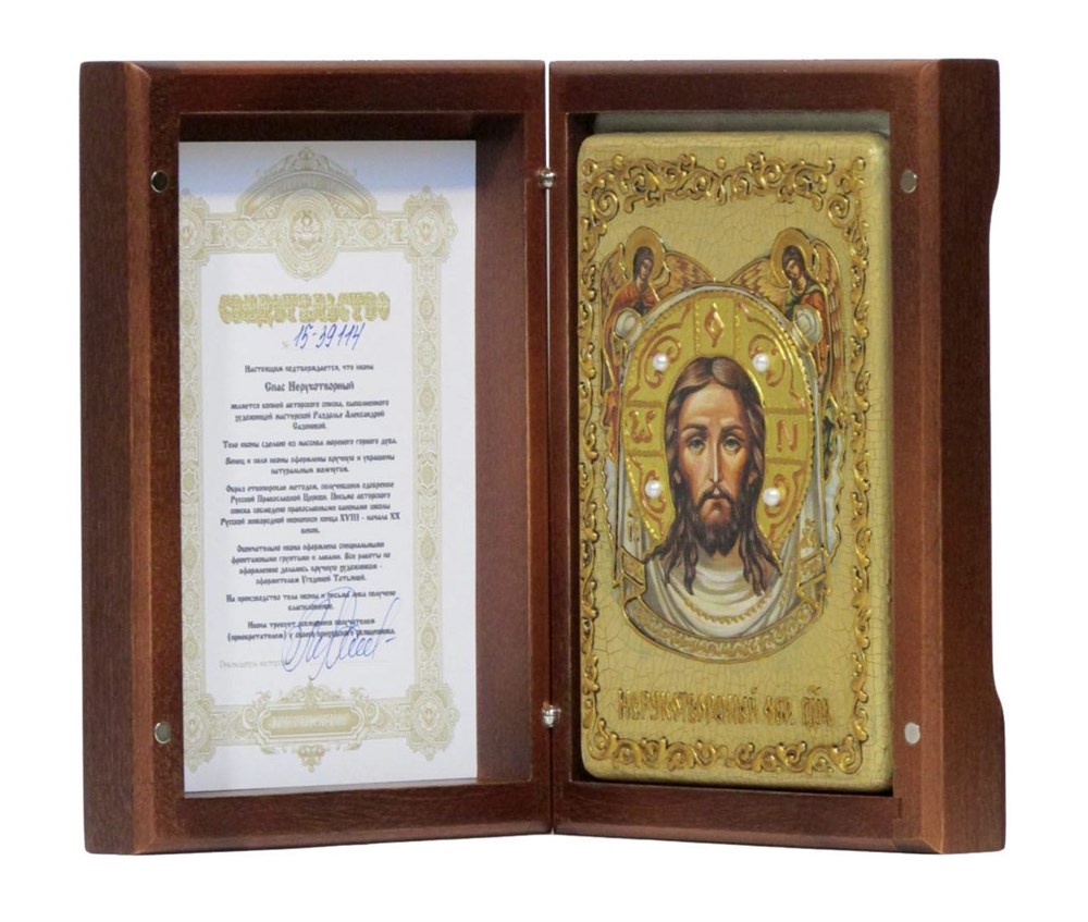 Каждая икона поставляется в подарочной упаковке: декоративный деревянный футляр – шкатулка, замшевая подушечка для иконы 15 см и замшевый покров для икон в размере 20 и 29 см, свидетельство номерное на икону.