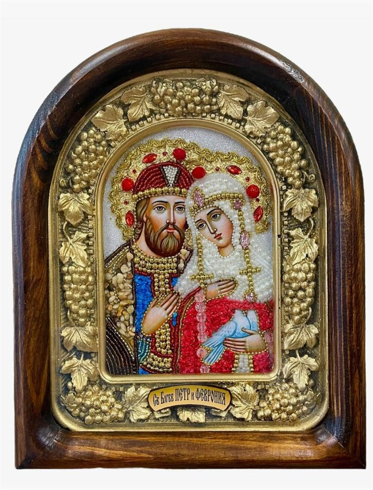 Икона Святые Благоверные Петр и Феврония украшенная бисером, стразами и бусинами.