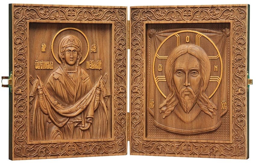 Диптих из резных икон Спас Нерукотворный и Покров Пресвятой Богородицы на дубовом цельноламельном щите.