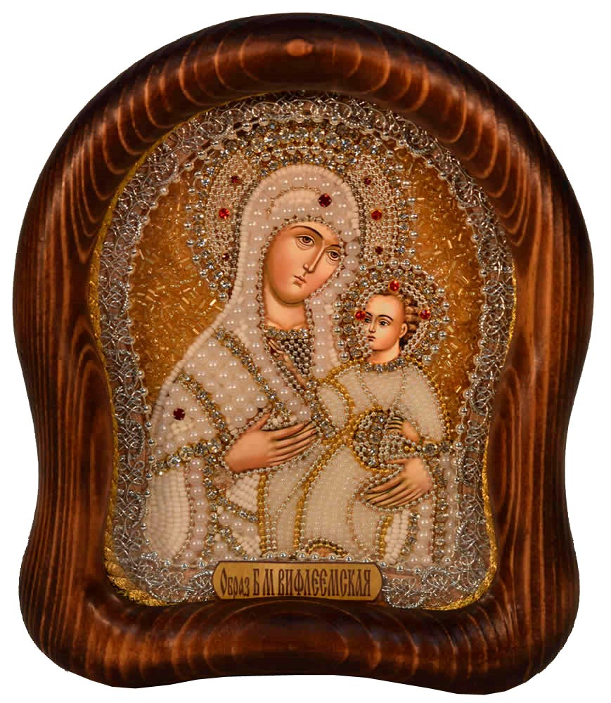 Дивеевская икона: Вифлиемская Божья Матерь, бисер, камни, оклад из дерева
